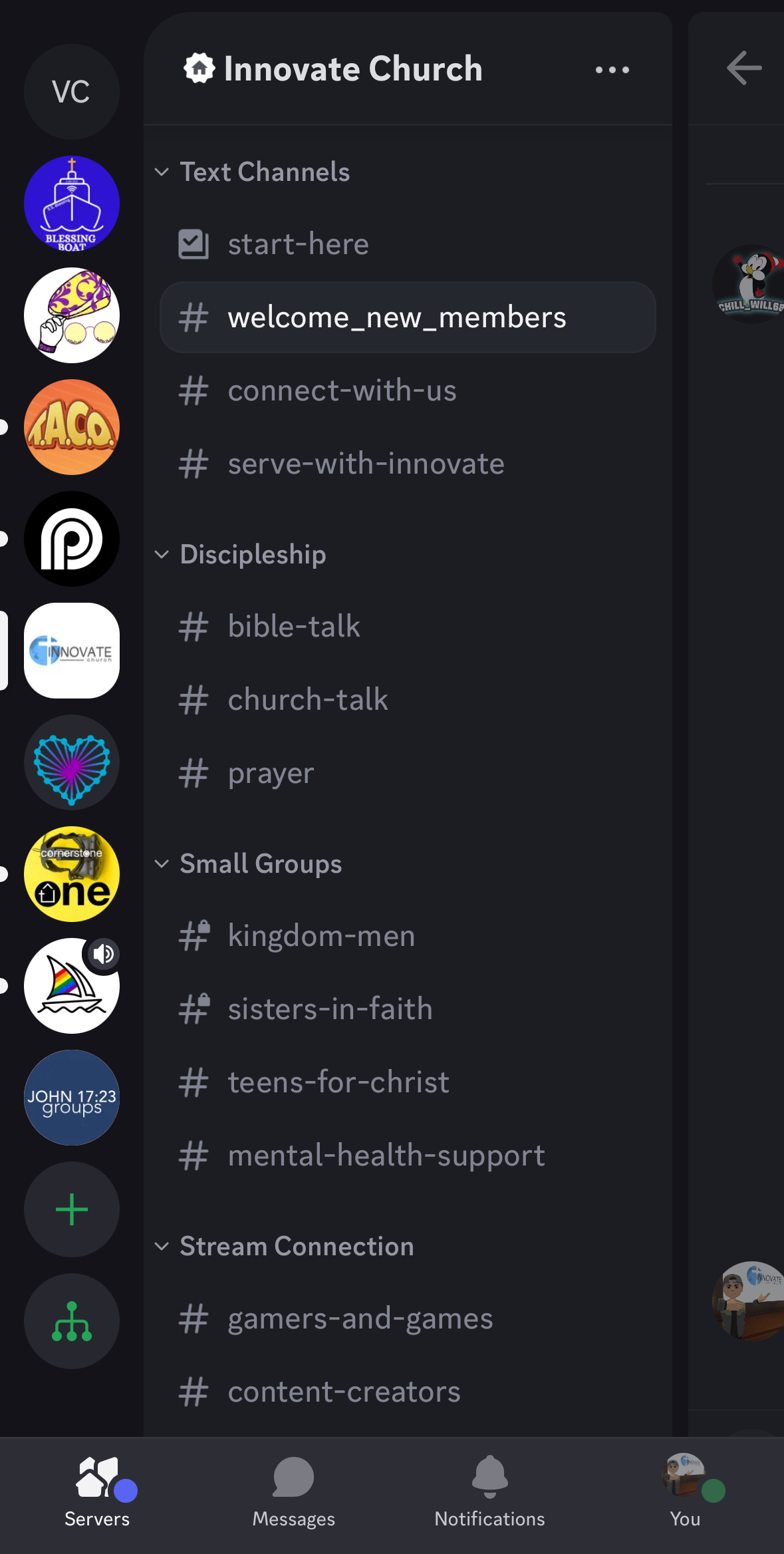 This is my app. You won’t have the bunch of icons on the left until you join multiple Discord communities as I have. You can see our channel list to the right of those icons…”Start-Here,” “Welcome-New-Members,” etc. If the channel has a little lock icon like the Kingdom Men channel does, that is because it is an invite-only channel. An admin, or myself, can invite you in.