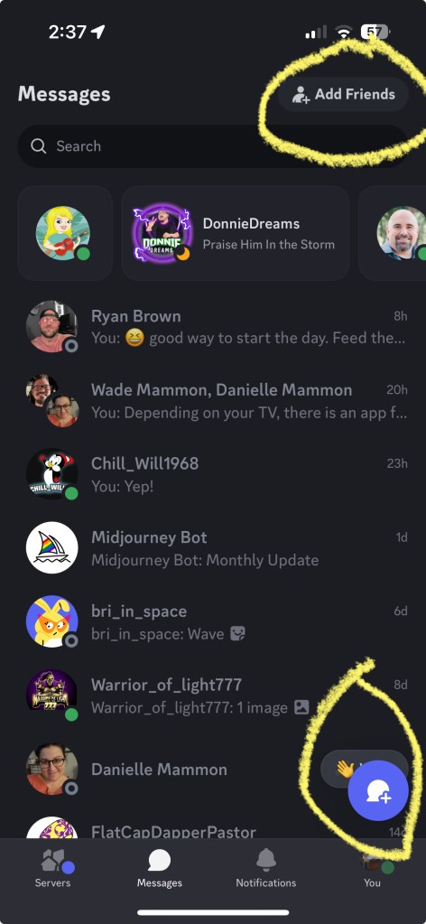 There are two important buttons I circled here. The top one is your “Add Friends” button. There you can search for friends or message someone off Discord an invite link. The circled button at the bottom is used to begin a new message.