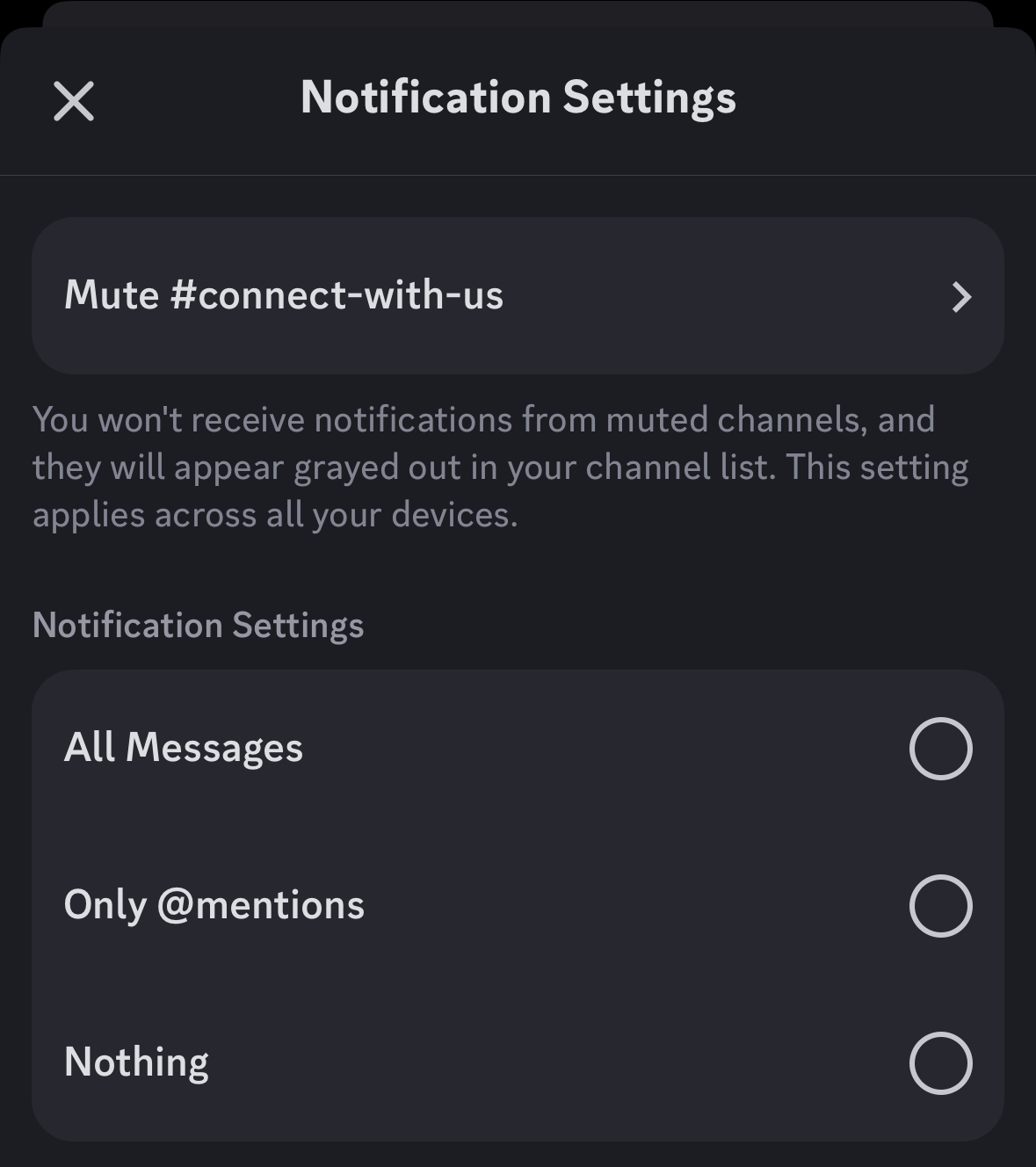 The other thing is the individual channels. Say there is one in particular that you want to ignore or be notified about everything. You can access the individual channel notifications by long pressing on the title of the channel. This pops up a menu for you.